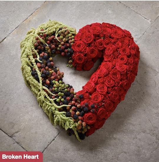 This tribute represents the emotions felt at a time of great loss. One side of the heart shows everlasting love with classic red roses, while the other conveys the grief felt on this sad day.