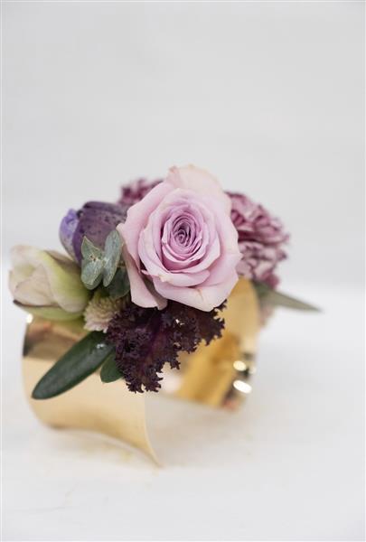 A beautiful bespoke cuff corsage. Available in either gold or silver. Created with colours matching your theme.