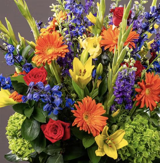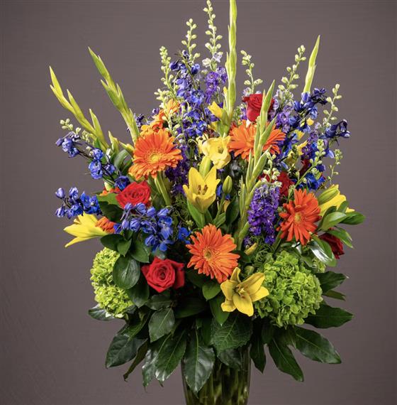 This is a lovely arrangement, featuring hydrangeas, Larkspur, Gladioli, lilies, gerborah and roses.