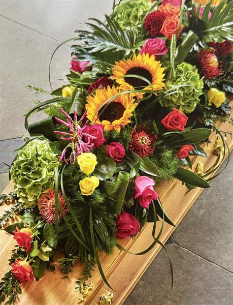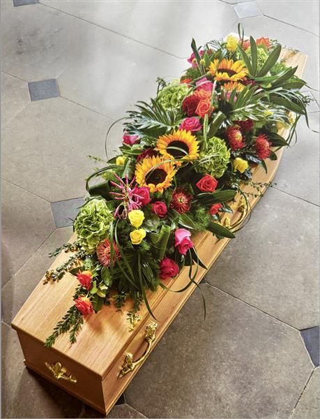 Lush exotic flowers and vibrant colours in this full-length coffin tribute make this a lavish final gift for a lavish final gift for a lively personality.