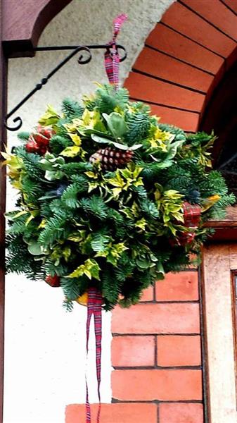 Fresh spruce, holly, cinamon, oranges, pine cones