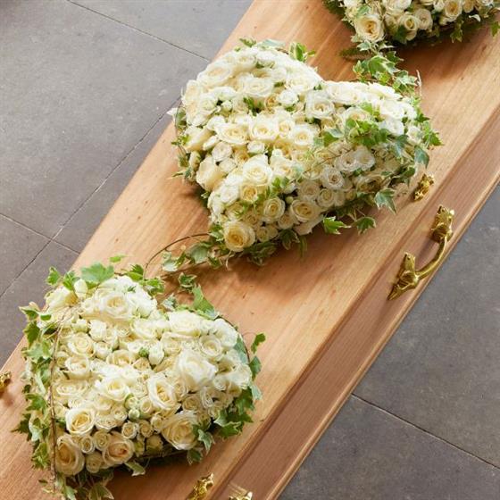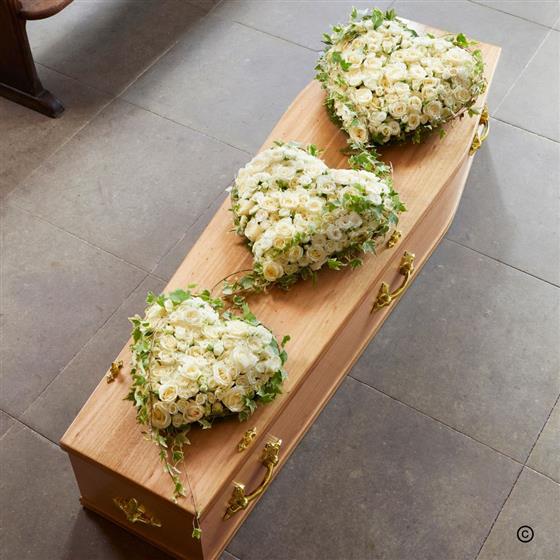 This bespoke coffin signifies family love and consists of three hearts bound together with ivy, representing faithfulness and eternal life. Each beautiful heart can feature a special written farewell message.