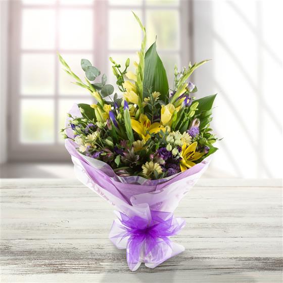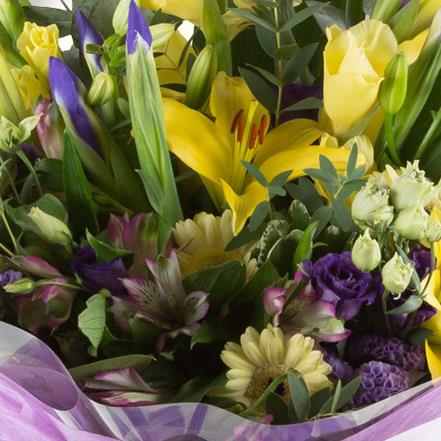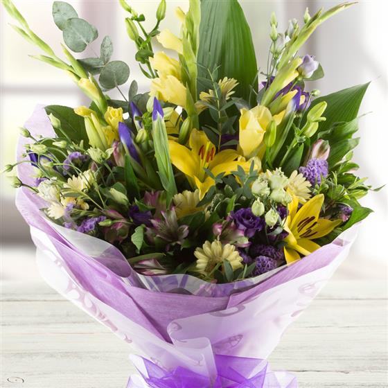 A large hand-tied bouquet of seasonal lilacs and lemons, including lilies, lisianthus, alstromeria and mini gerberas.