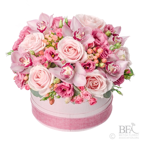 A selection of flowers including lisianthus, roses and other beautiful seasonal flowers presented in a quality hat box