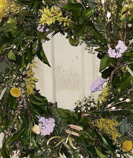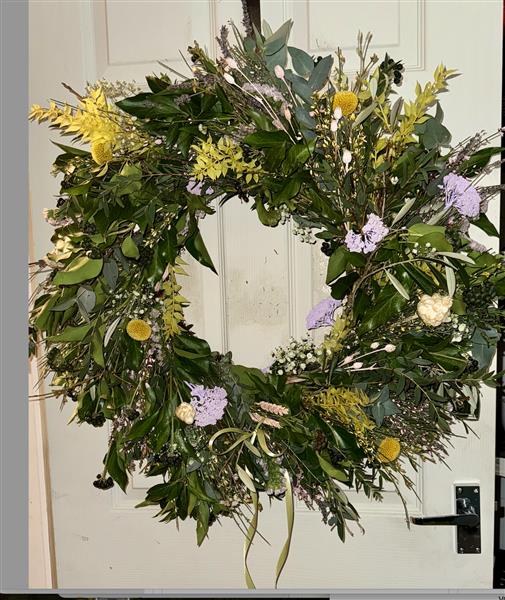 Beautiful hand made Spring Wreath, featuring lovely pastel colours, made of natural flowers on a moss ring.