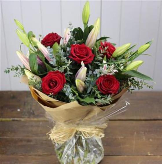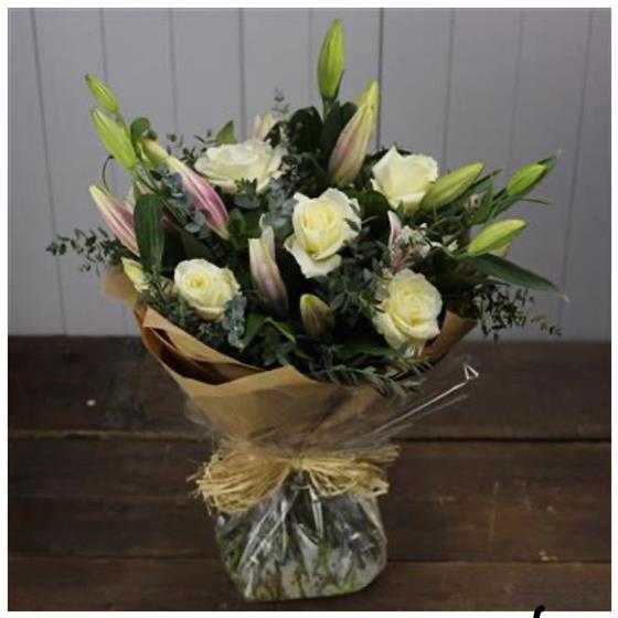 5 Beautiful Fresh Roses, guaranteed to last 7 days and 3 Scented Oriental lilies with complimenting foliages. Simply pick the colour of your roses for your perfect bouquet.