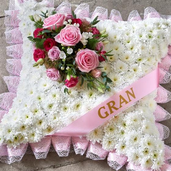 The cushion tribute conveys comfort and rest for a loved one. With delicate edging and feminine colouring, it is a perfect choice for a beloved grandmother. Personalised tributes are a significant way of honouring cherished memories.