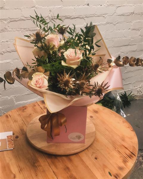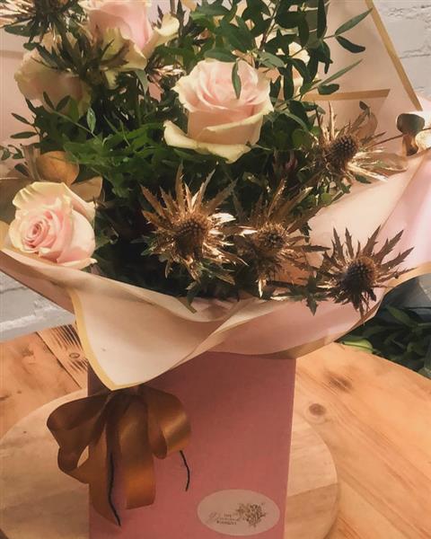 A beautiful bouquet with pink roses, gold thistles eucalyptus and mixed greens presented in beautiful box and packaging.
