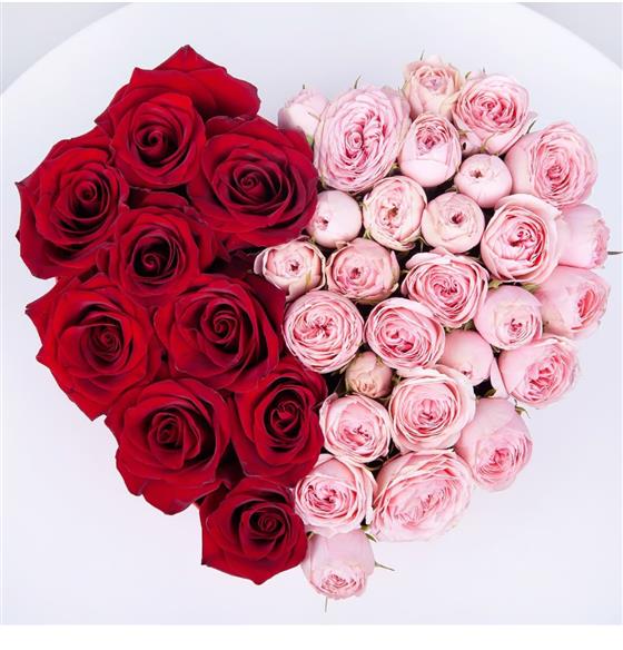 A beautiful heart arrangement with red roses and pink spray roses