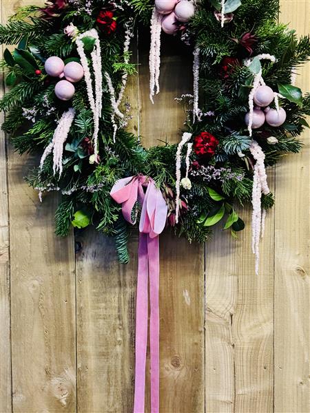 A beautiful mixed foliage wreath. Featuring touches of pink giving it a modern design with a beautiful pink velvet ribbon