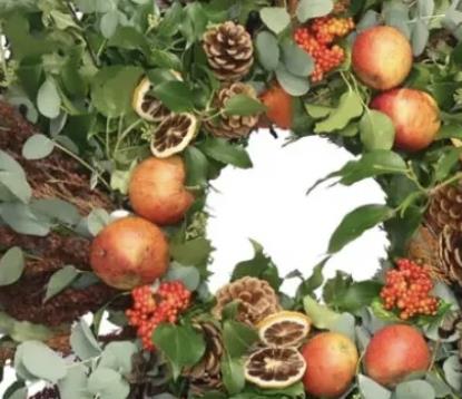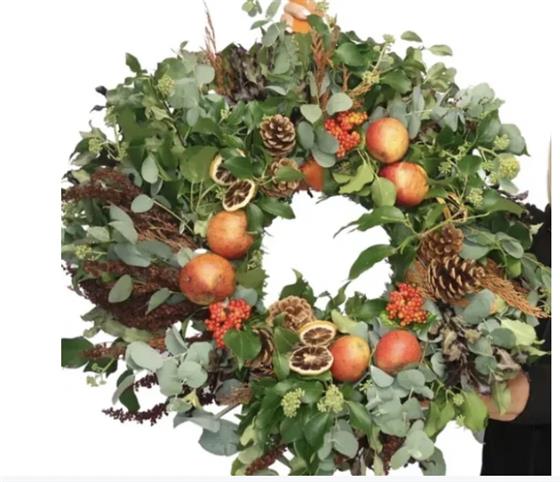 Each wreath is bespoke but includes natural greens, oak leaf, pine cones dried fruits, and fresh apples.