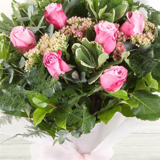 A hand-tied bouquet of six long stemmed pink roses encased in a selection of greenery.