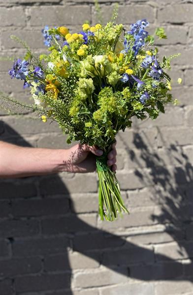 This gorgeous bridal bouquet has a mix of gorgeous flowers with a pop of blue from cornflower and delphinium.