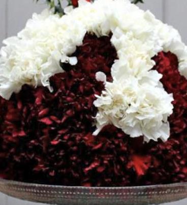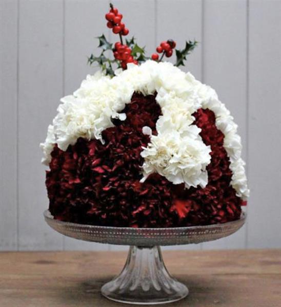This clever arrangement is a fun and festive addition to your Christmas table. Pretty clove and white carnations on a glass cake stand are arranged to create a floral Christmas pudding that will delight your friends and family.