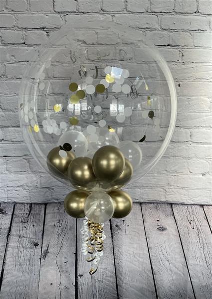 The perfect combination for that special person that loves a bit of shiny gold. A mix of Gold and white confetti. Gold and clear balloons.