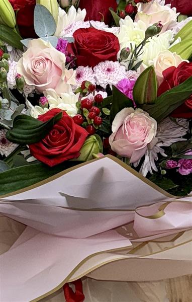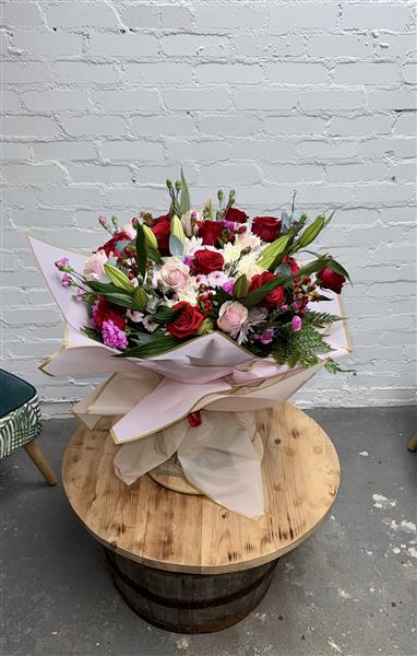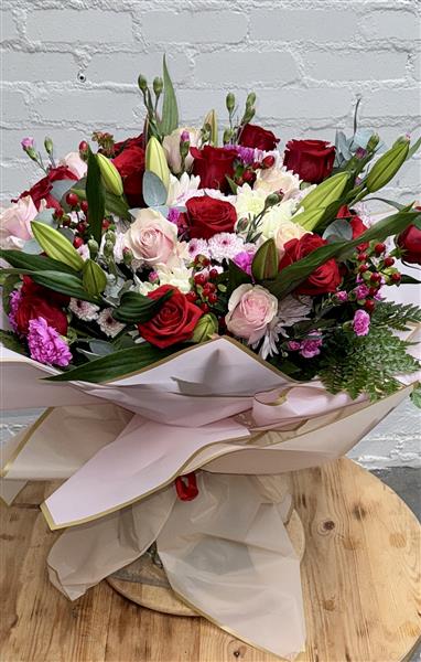This Grand Blush Bouquet is a gorgeous combination of pinks and reds including high quality roses and lilies . Make a grand gesture with this huge bouquet.