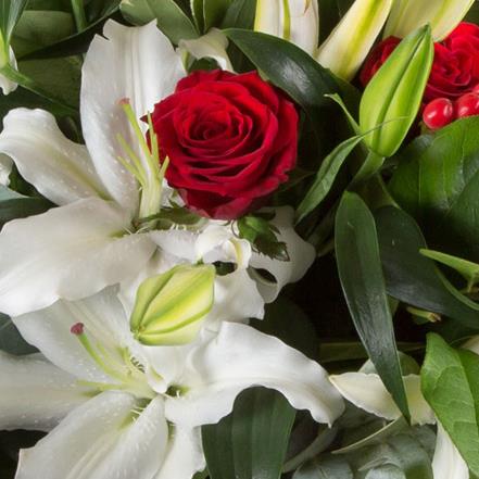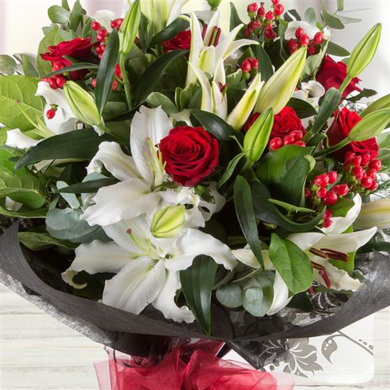 An beautiful display of highly fragranced white lilies and fabulous red roses mingled with a variety of foliage and berries.