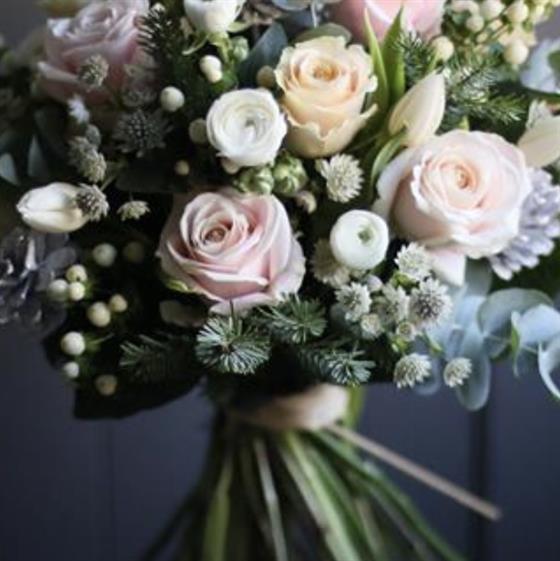 A winter bouquet of seasonal flowers in blush, nude tones.