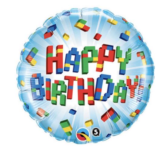 This birthday foil balloon features a design of flying construction blocks, with a vibrant 'Happy Birthday' message. It is ideal for decorating a child's birthday party, or for giving as a gift on the day.